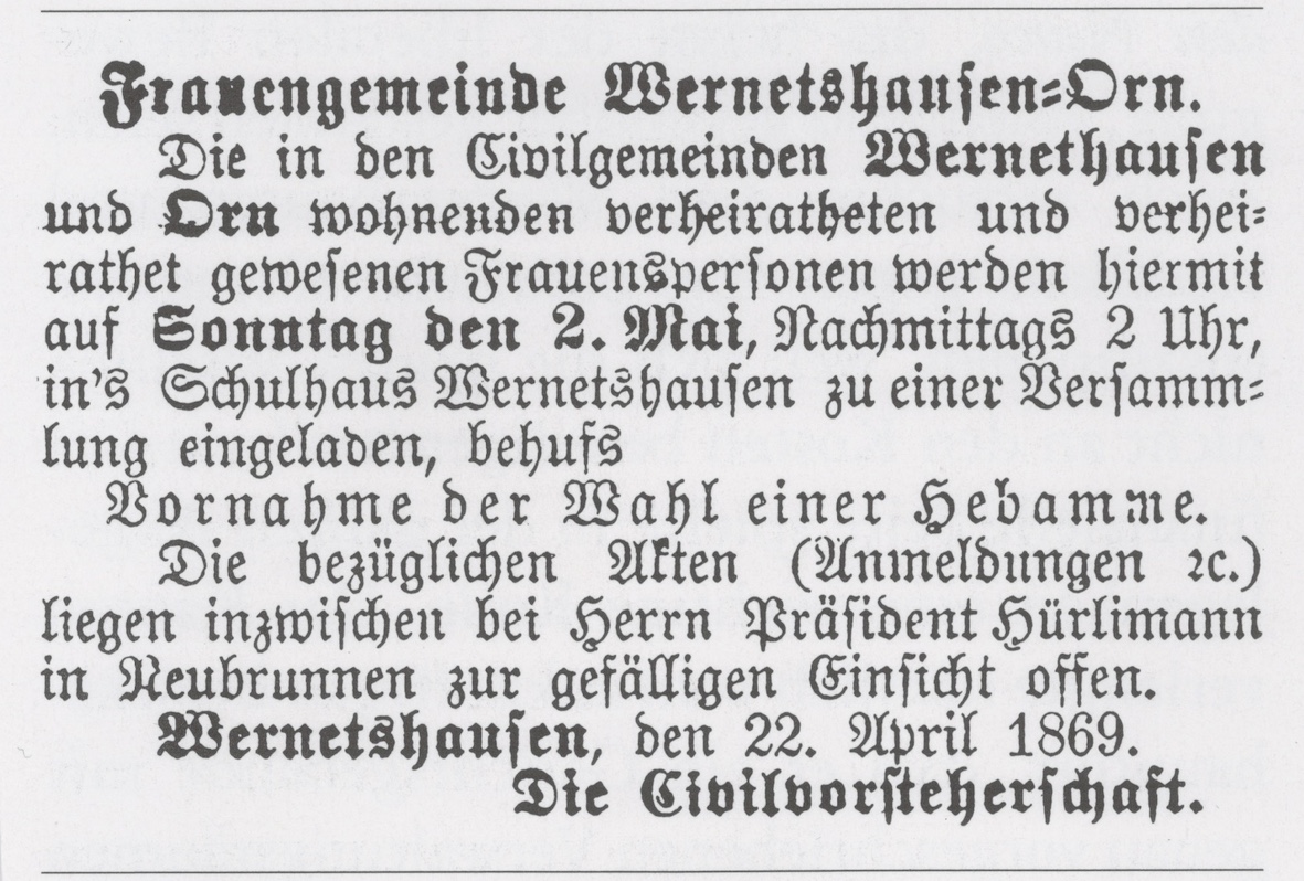 Aus: Hinwilpedia / Von: unbekannt / Lizenz: CC BY-NC-SA 3.0 CH / Link: https://www.hinwilpedia.ch/Datei:18690424_Frauengemeinde_Wernetshausen_Inserat.jpg