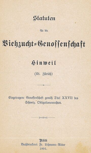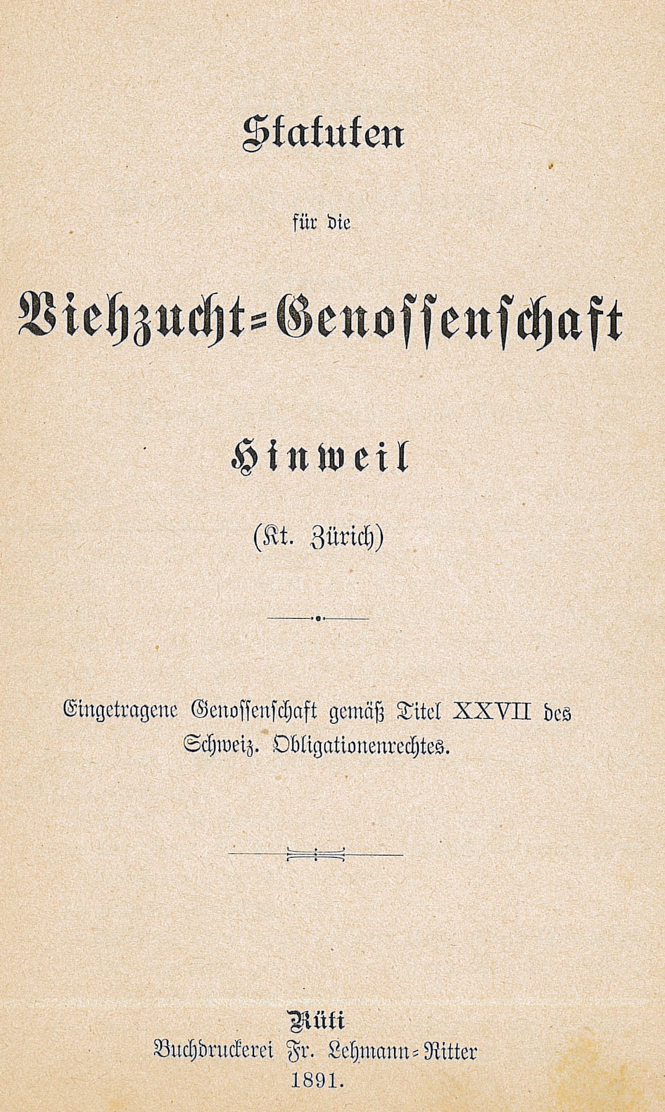 Aus: Hinwilpedia / Von: unbekannt / Lizenz: CC BY-SA 4.0 / Link: https://www.hinwilpedia.ch/Datei:18910913_Viehzuchtgenossenschaft_Hinweil_Statuten.jpg