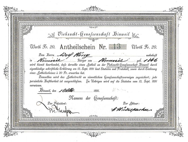 Aus: Hinwilpedia / Von: unbekannt / Lizenz: CC BY-SA 4.0 / Link: https://www.hinwilpedia.ch/Datei:18911002_Anteilschein_Viehzuchtgenossenschaft_Hinwil.jpg