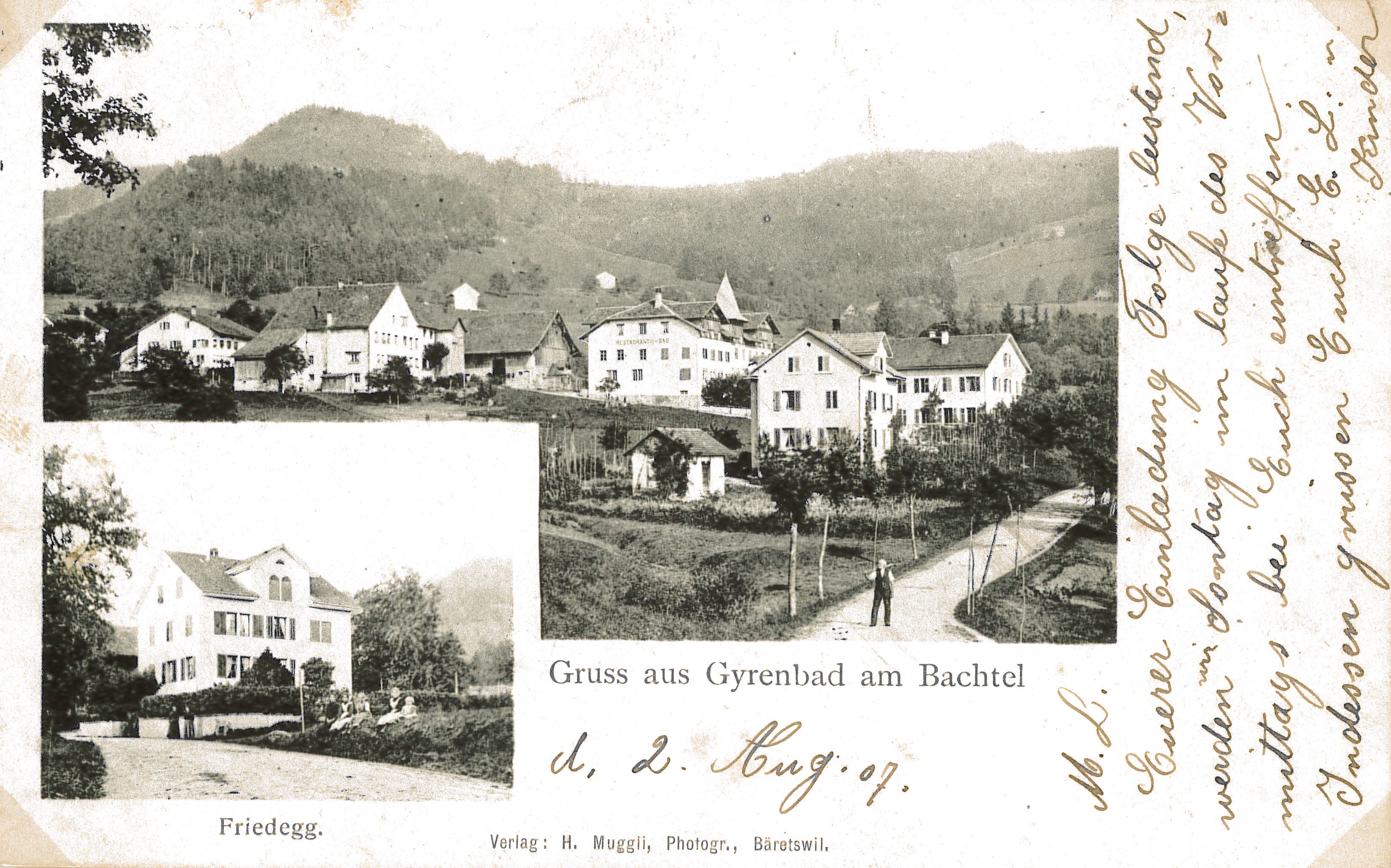 Aus: Hinwilpedia / Von: H. Muggli Photogr., Bäretswil / Lizenz: CC BY-NC-SA 3.0 CH / Link: https://www.hinwilpedia.ch/Datei:19070802_Postkarte_Girenbad_Hinwil_Friedegg_300.jpg