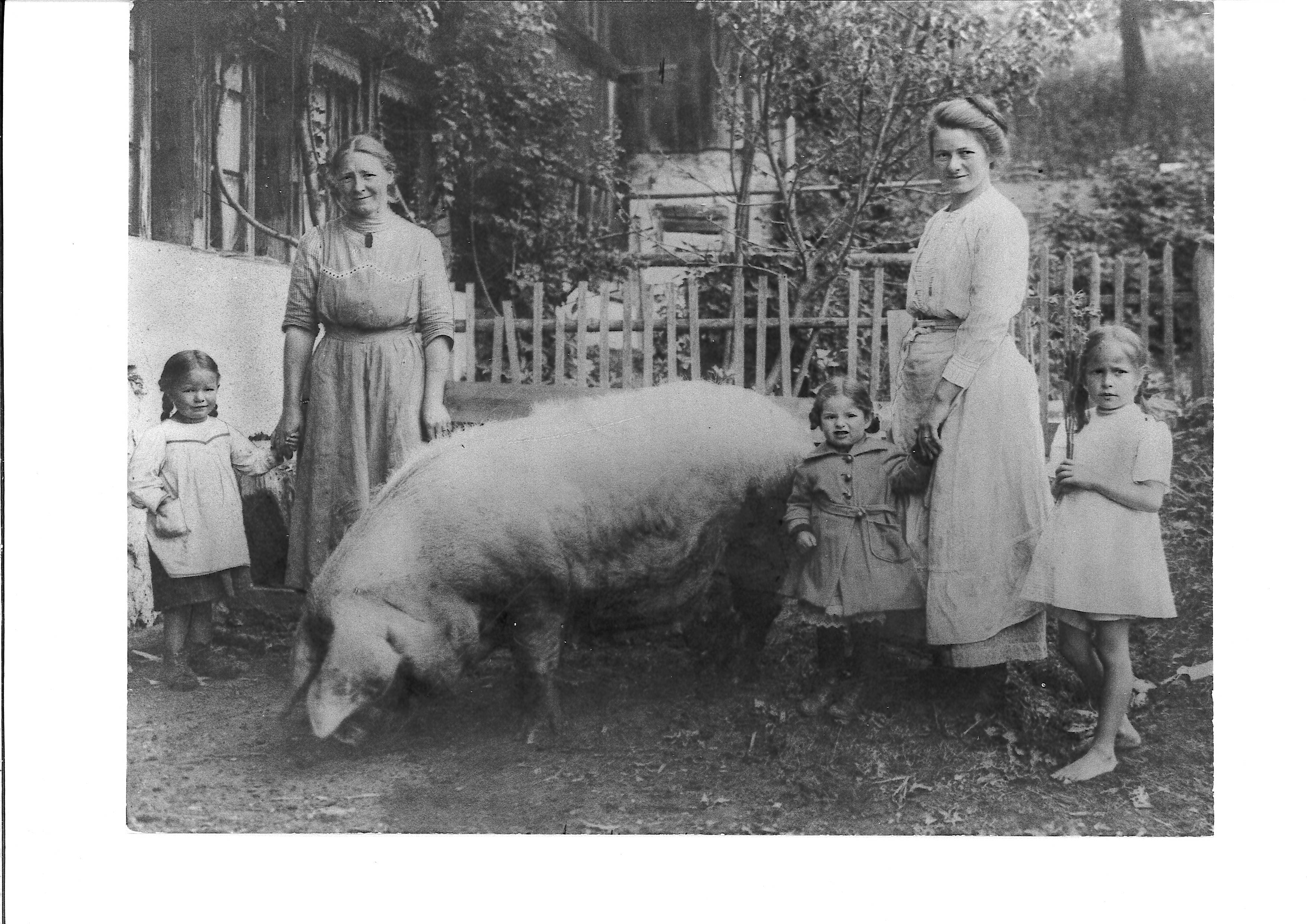 Aus: Hinwilpedia / Von: unbekannt / Lizenz: CC BY-NC-SA 3.0 CH / Link: https://www.hinwilpedia.ch/Datei:19200000_Familie_Wolf_Allmenhof_Hinwil_mit_Hausschwein.jpg