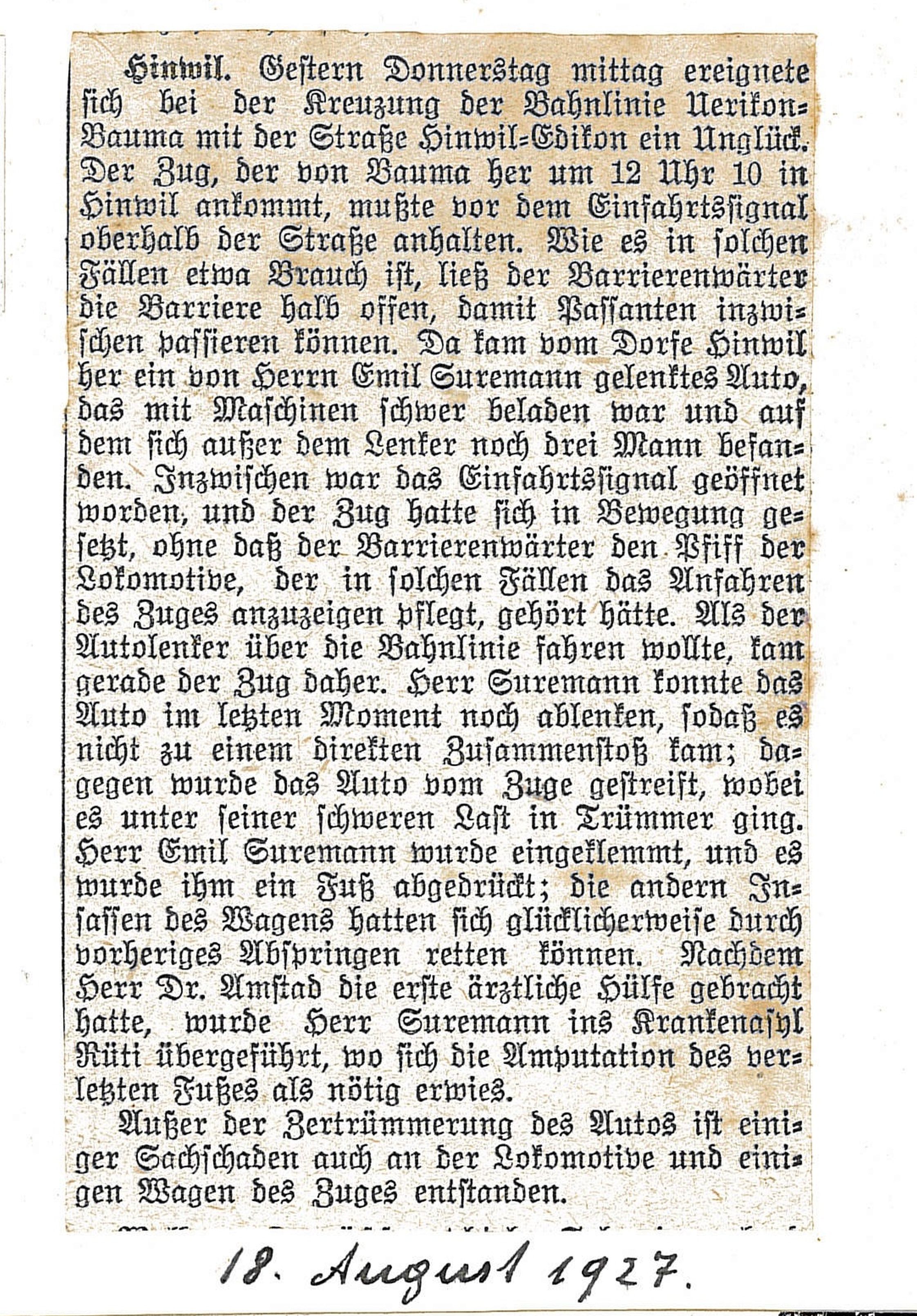 Aus: Hinwilpedia / Von: Beatrice Hagen / Lizenz: CC BY-SA 4.0 / Link: https://www.hinwilpedia.ch/Datei:19270818_Unfall_Emil_Suremann,_Gemeindechronik1927.jpg