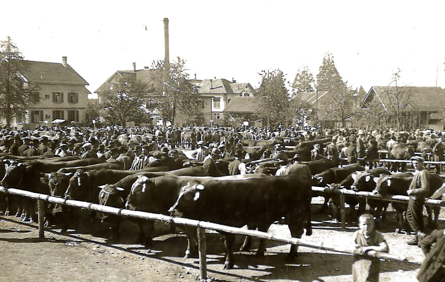 Aus: Hinwilpedia / Von: Feurer-Bodmer, Henri (1880–1962) Chronist (Vermutung) / Lizenz: CC BY-SA 4.0 / Link: https://www.hinwilpedia.ch/Datei:19290726_Viehausstellung_Gemeindeplatz_Hinwil_mit_Kamin_Eble.jpg