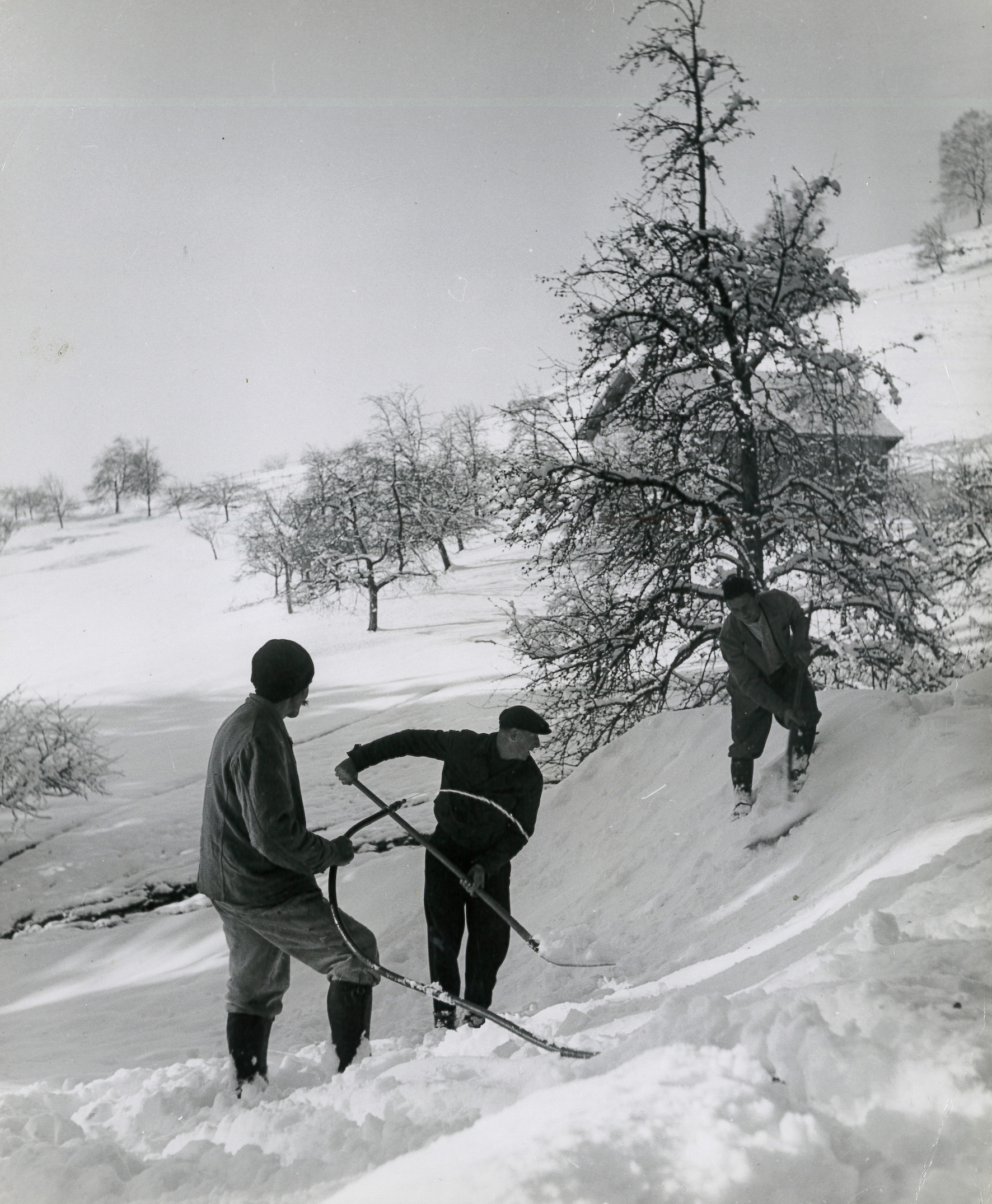 In der Mitte mit Schirmmütze Bobpionier Gottfried Kägi (1911–1998). Die Fotografin Margrit Schmidhauser war Reporterin in Zürich, unter anderem für die Zeitschrift Sie und Er. |
