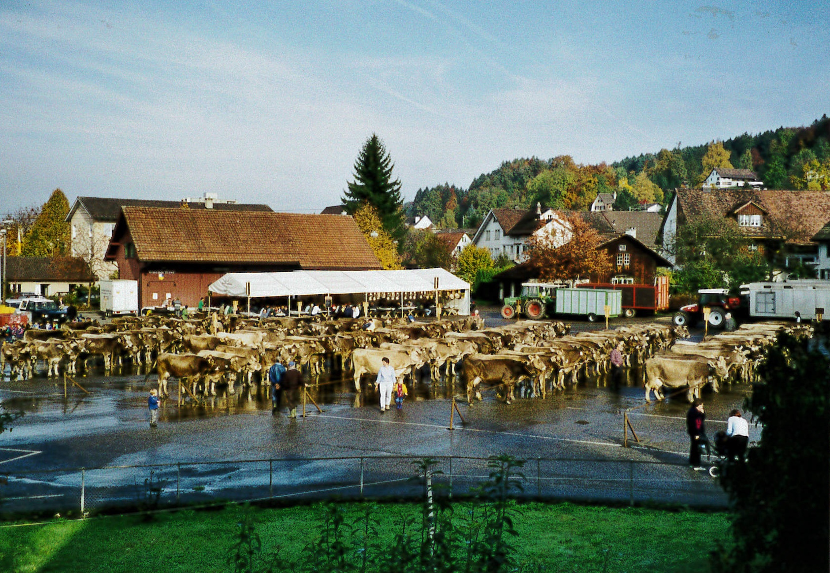 Aus: Hinwilpedia / Von: Ruf, Kurt (1930–2013), Ortschronist / Lizenz: CC BY-SA 4.0 / Link: https://www.hinwilpedia.ch/Datei:20001025_Viehschau_Gemeindeplatz_Hinwil.jpg