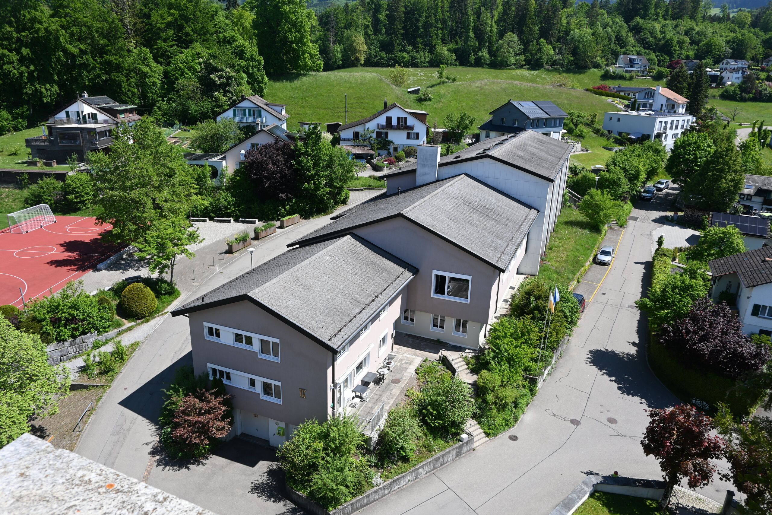 | Beschriftung: | Kirchgemeindehaus und Schulhaus Felsenhof vom Kirchturm aus, 2025 |