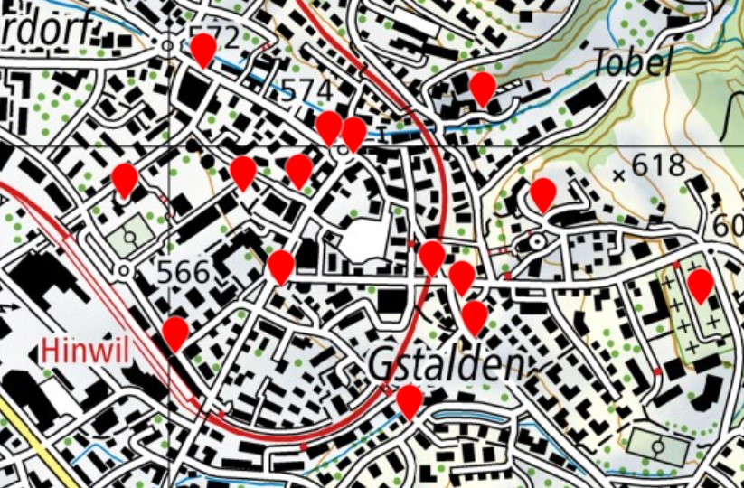 | Beschriftung: | Karte von 15 öffentlichen Brunnen im Ortskern von Hinwil |