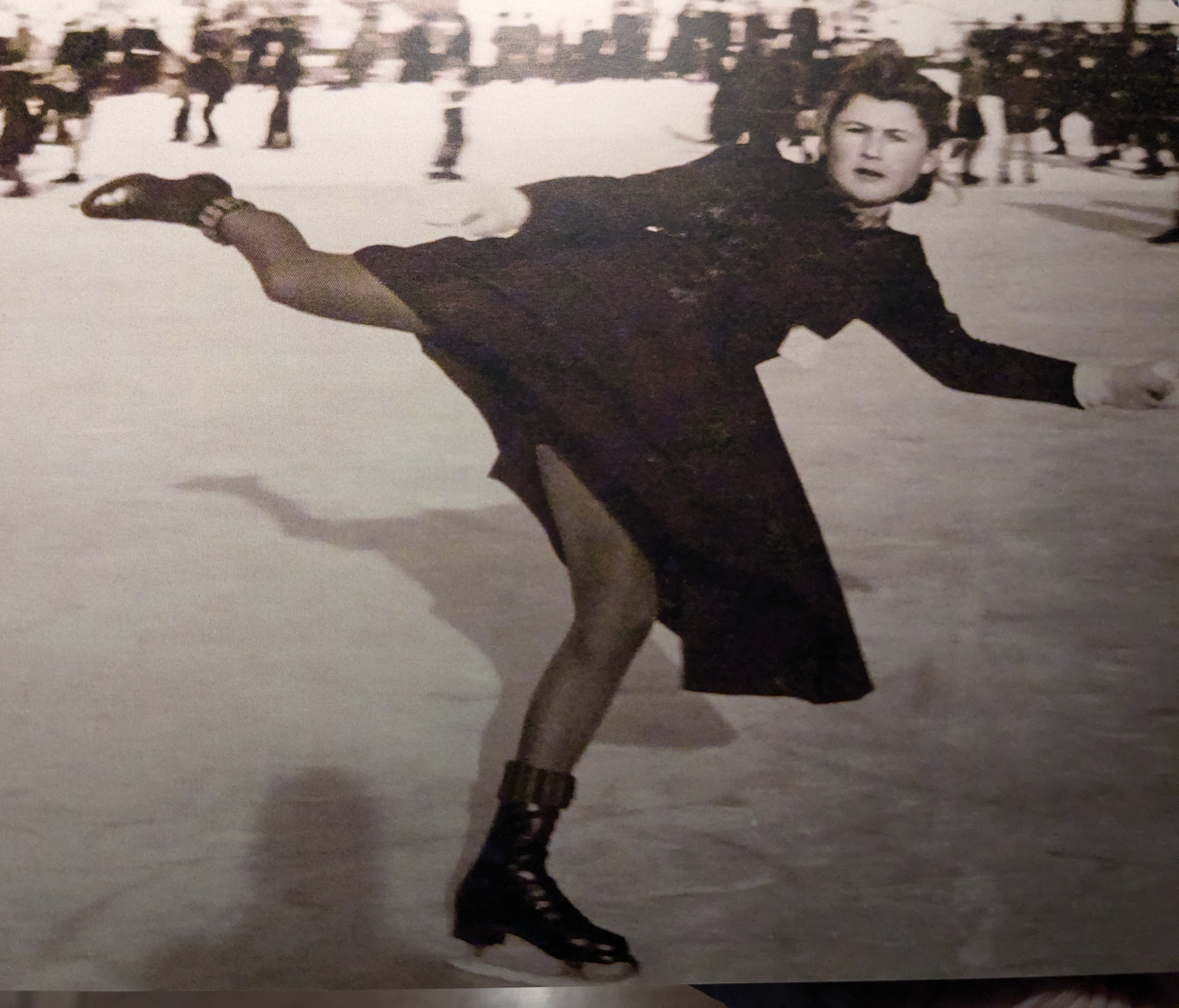 | Beschriftung: | Dora Neukom mit ihrem braunen Schlittschuh-Kostüm |