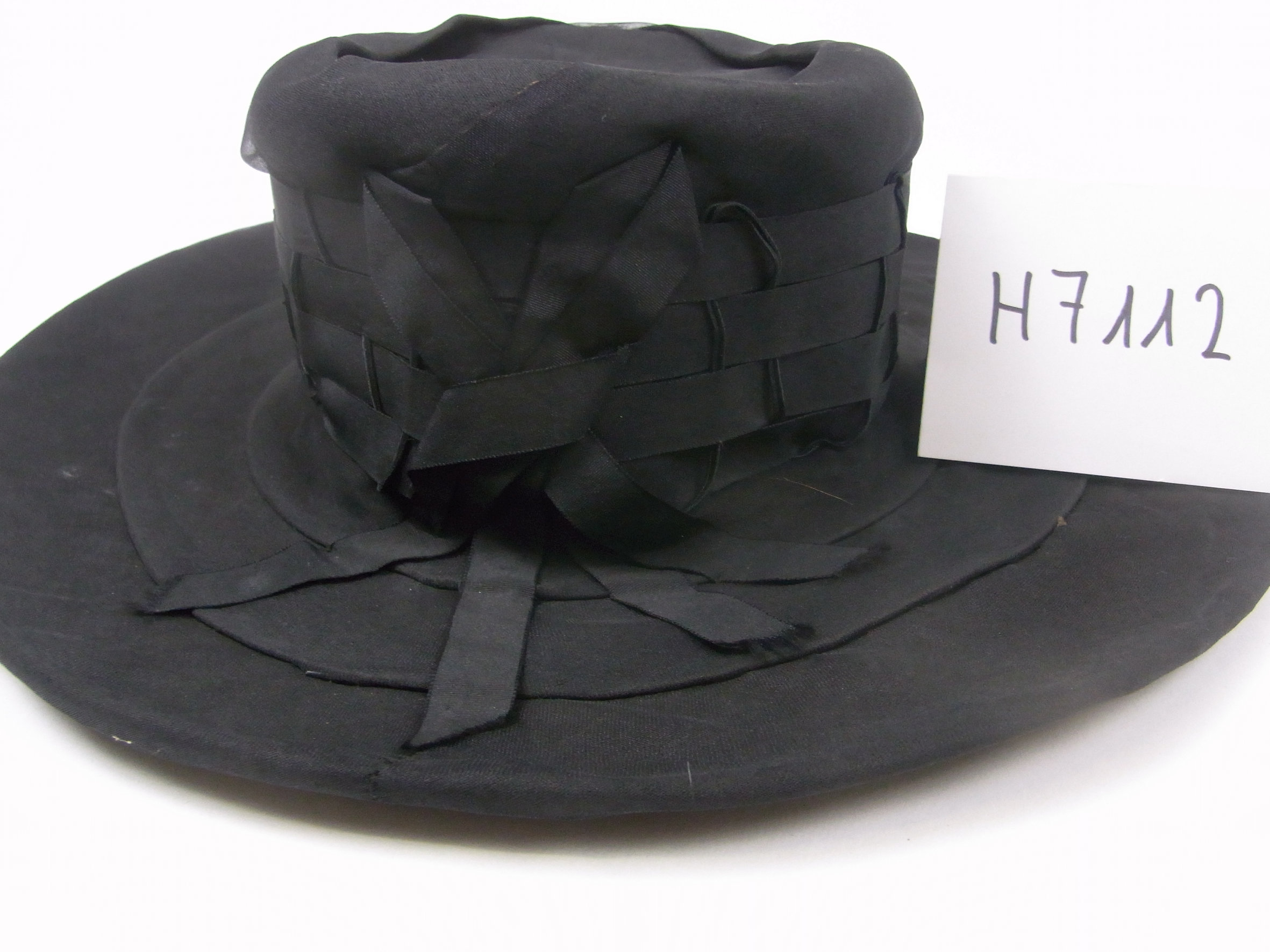 | Beschreibung: | Schwarzer Damenhut aus Stoff mit breitem Rand und Verzierung mit Bändern |