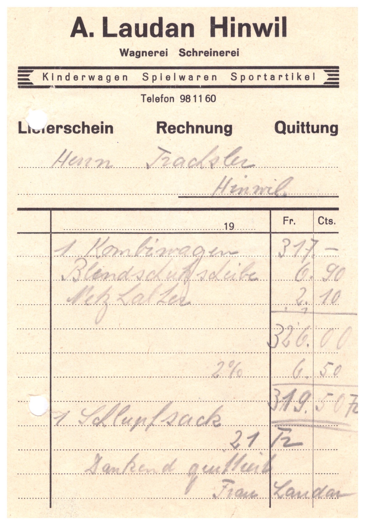 Aus: Hinwilpedia / Von: Francesca Bircher, Hinwil / Lizenz: CC BY-SA 4.0 / Link: https://www.hinwilpedia.ch/Datei:Quittung_Kinderwagen_Laudan_Objekt_H5245.jpeg
