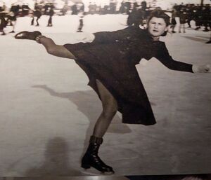 | Dora Neukom mit ihrem braunen Schlittschuh-Kostüm | winterbekleidung, Sportbekleidung | Album der Familie Neukom | ||
